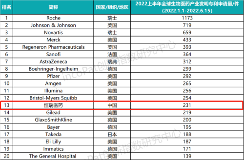 近日,全球专利数据库incoPat创新指数研究中心发布全球生物医药发明专利TOP100榜单,金年会|jinnianhui以上半年231件发明专利申请量位列榜单第13名,是唯一一家进入TOP20的中国药企。