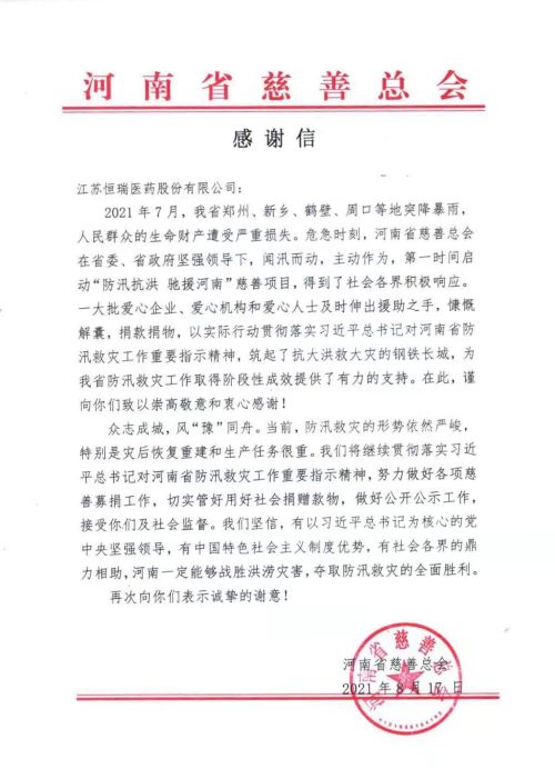 近日,河南省慈善总会给金年会|jinnianhui发来感谢信,向金年会|jinnianhui在河南暴雨洪涝灾害中捐款1000万元表示衷心感谢。金年会|jinnianhui表示,灾害无情人有情,向受灾同胞伸出援手是恒瑞人义不容辞的责任。