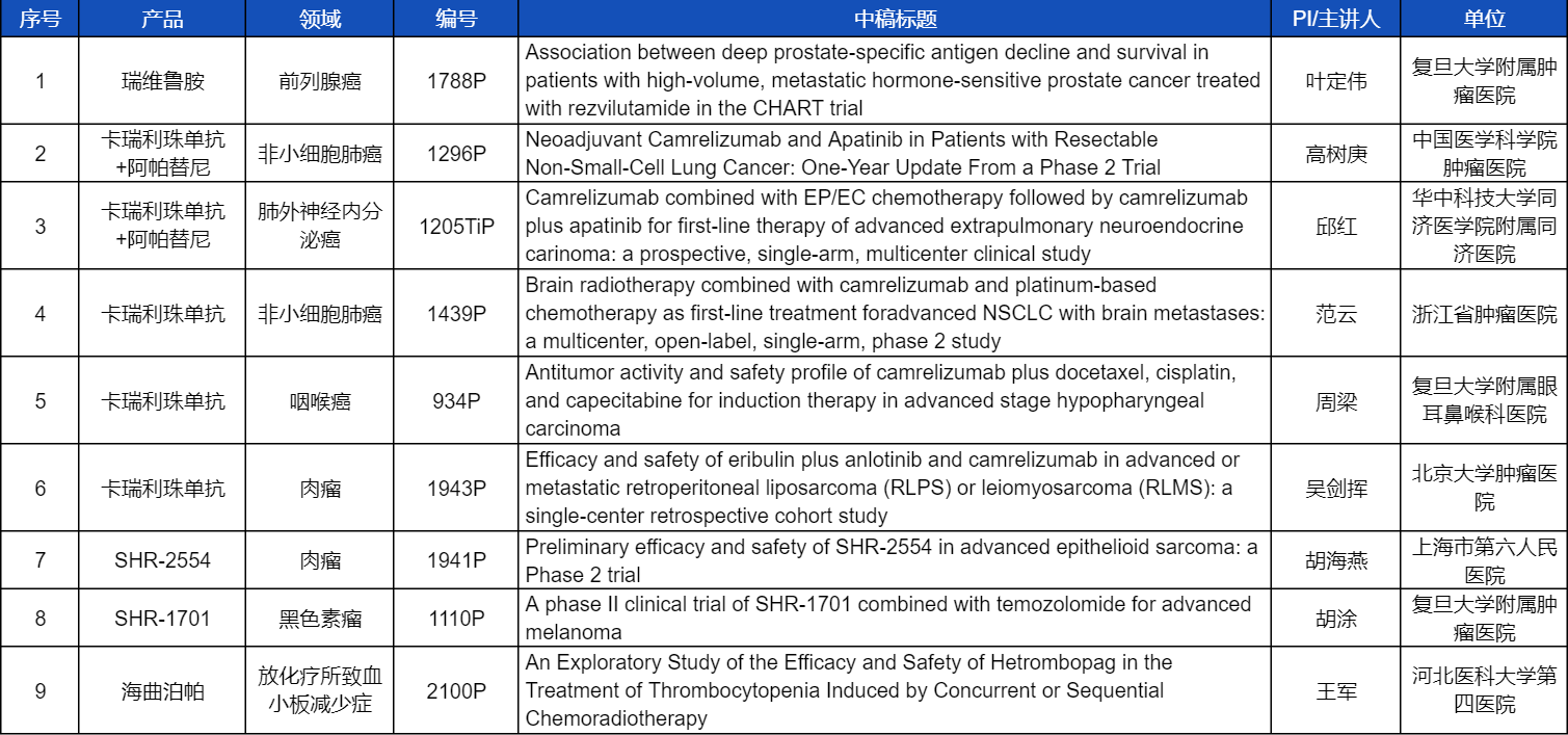 在非小细胞肺癌、咽喉癌、肉瘤、前列腺癌、黑色素瘤等多个领域,卡瑞利珠单抗、阿帕替尼、瑞维鲁胺、SHR-1701、SHR2554等创新产品相关研究一共入选了8项壁报展示。此外,金年会|jinnianhui自主研发的血小板生成素受体激动剂(TPO-RA)海曲泊帕在放化疗所致血小板减少领域的探索性研究显示良好的疗效,入选壁报展示。