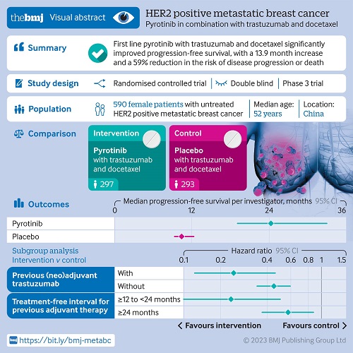 [1] Xu BH,Ma F, Yan M, et al. Pyrotinib versus placebo in combination with trastuzumab and docetaxel as first line treatment in patients with HER2 positive metastatic breast cancer (PHILA): randomised, double blind, multicentre, phase 3 trial. BMJ 2023;383:e076065.