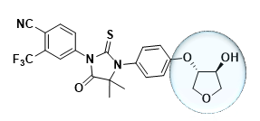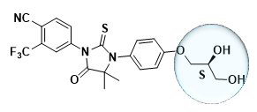 接下来进入第二轮优化。在第1个候选化合物的杂环氧基上引入羟基取代基,得到了第2个候选化合物(图3)。这款化合物体外活性略优于全球首个二代AR拮抗剂。与候选化合物1相比,分子极性增加,clogP降低,hERG钾通道抑制作用也大大降低,同时大鼠口服吸收利用度也有了大幅提升。然而美中不足的是,这款化合物结构较为复杂,分子中含有两个手性中心,合成难度高,在药物的可开发性上不是很优异。