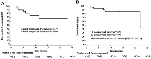 35例接受吡咯替尼RP2D治疗的患者中有27例进行了基线后肿瘤评估,ORR为92.6%,DCR为100%,其中,3例(11.1%)患者完全缓解,22例(81.5%)患者部分缓解,2例(7.4%)患者疾病稳定。经确认后的ORR为77.8%,包括2例(7.4%)患者完全缓解,19例(70.4%)患者部分缓解。此外,在全分析集(FAS集)中,经确认的ORR为61.0%,共有7个PFS事件,中位PFS尚未达到,6个月和12个月的PFS分别为81.1%和67.0%(图2A)。中位OS为22.1个月,6个月和12个月时的OS率分别为94.3%和86.4%(图2B)。接受吡咯替尼RP2D治疗的患者,6个月和12个月的PFS率分别为91.8%和84.2%,OS率为96.6%和91.5%。