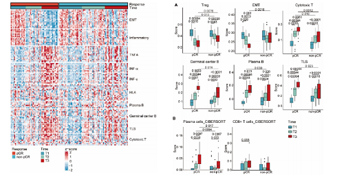 探索性分析表明,在non-pCR和pCR中没有明显的驱动突变频率和其他基因组因素的区别。通过多重免疫荧光(mIF)和免疫组化(IHC)分析发现免疫细胞丰度和肿瘤MHC-I、MHC-II的表达相关。经化疗诱导和新辅助免疫联合化疗治疗后,与治疗相关的通路分析显示,在pCR患者中EMT(上皮间质转化)明显降低,而在non-pCR患者中并未观察到这一现象;所有患者的调节性T细胞(Treg)显著降低,pCR患者降低幅度更大。相反,浆细胞、生发中心B细胞、三级淋巴结构、细胞毒性T细胞在治疗后逐渐增加,值得注意的是,pCR患者在这些方面比non-pCR显示出更显著的变化(图3)。