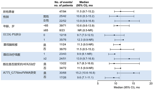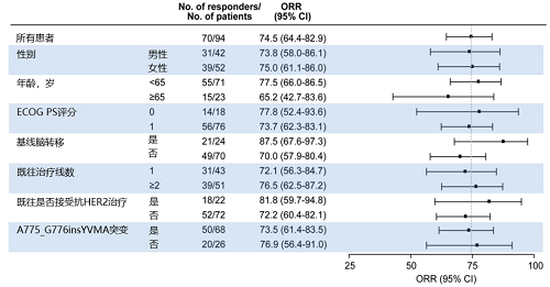 纳入患者均为中国人群,既往严重经治(中位既往治疗2线,铂类化疗、免疫治疗经治),且允许既往HER2-TKI经治(23.4%),ECOG评分大多为1分(80.9%),25.5%患者基线脑转移,最常见的HER2突变是第20号外显子插入突变,A775_G776insYVMA(72.3%)。